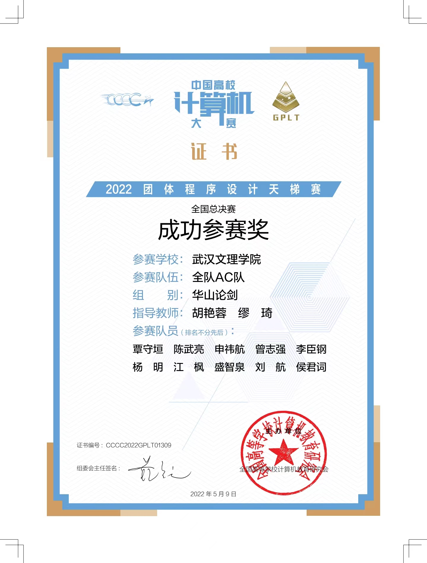 近日,第七届中国高校计算机大赛-团体程序设计天梯赛总决赛落下帷幕,在“华山论剑”组别,由我院胡艳蓉、缪琦等老师指导的“全队AC队”荣获湖北省团队三等奖和全国总决赛成功参赛奖。