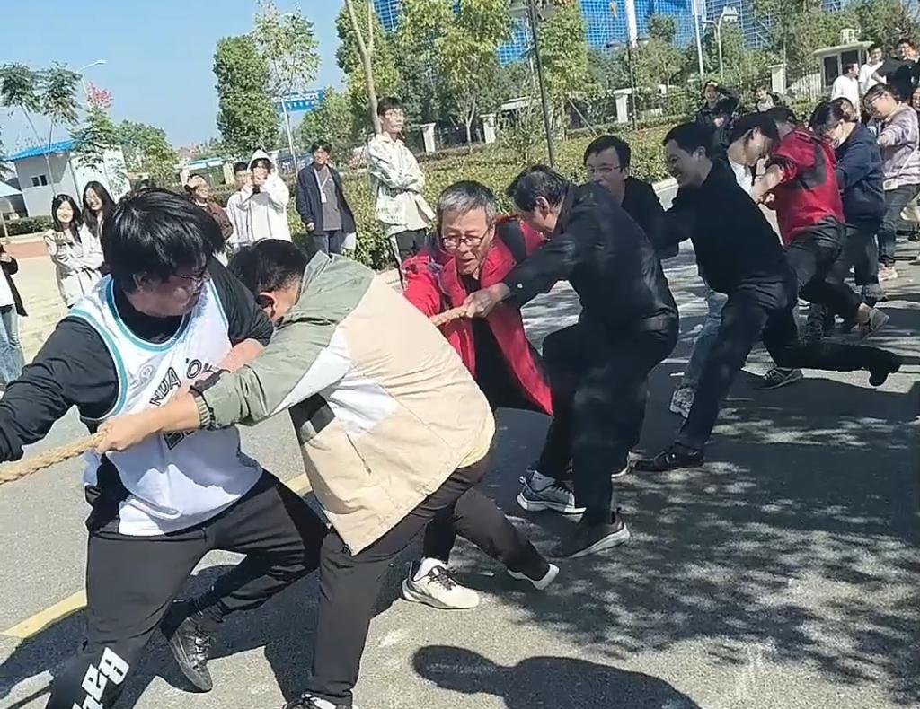 随着裁判员发令,拔河比赛正式开始,各队选手紧握长绳,脚蹬地面,齐心协力向后拉拽。啦啦队的加油声、欢呼声此起彼伏,为比赛增添了浓厚的氛围。