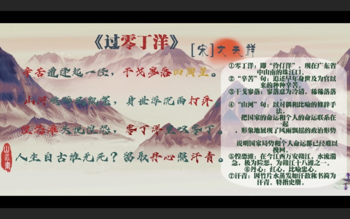 作品采用微课形式,以文天祥的《过零丁洋》为教学核心,通过跨学科的整合(计算机科学、文学、历史学),实现了与文天祥跨越时空的诗意对话,从而感悟到家国情怀。结合AI语音合成技术,本课程实现了对诗词情感的朗诵,深入阐释了“山河破碎风飘絮,身世浮沉雨打萍”所蕴含的悲凉情感,生动展现了惶恐滩兵败的紧迫氛围和零丁洋被俘的孤独与苦难。通过对古诗词逐句的深入分析,本课程深入挖掘了“人生自古谁无死,留取丹心照汗青”所体现的文天祥宁死不屈的高尚品质和爱国精神,旨在帮助学生深入理解诗歌的深层含义,深刻体会文天祥的壮烈情怀。