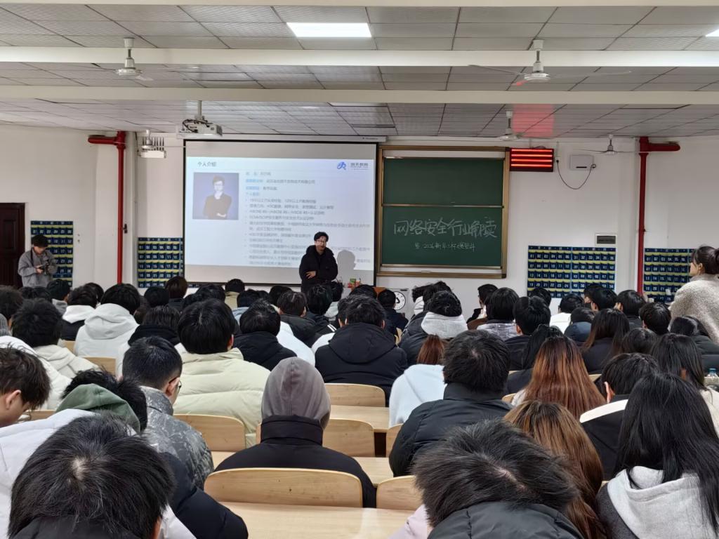 在同学们热烈欢迎的掌声中,武汉金信润天信息技术有限公司教研经理邓方鸣受邀作主题报告。邓经理以“网络安全行为解读”为切入点,深入剖析了当前网络安全面临的威胁与挑战,通过生动的案例和数据分析,揭示了网络攻击的常见手段及防护策略。他强调了网络安全在数字化时代的重要性,指出个人与组织需采取主动防御措施,以应对日益复杂的网络环境。