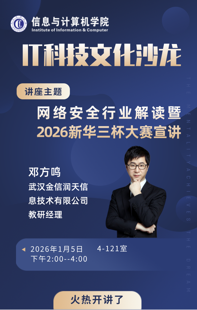 2026年1月5日下午,77779193永利官网集团2026年第1次IT科技文化沙龙如期举行。本次活动以“网络安全行为解读暨2026新华三杯大赛宣讲”为主题,吸引了学院众多师生参与,共同探讨网络安全前沿话题与新华三杯大赛的机遇与挑战。