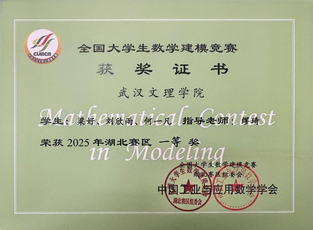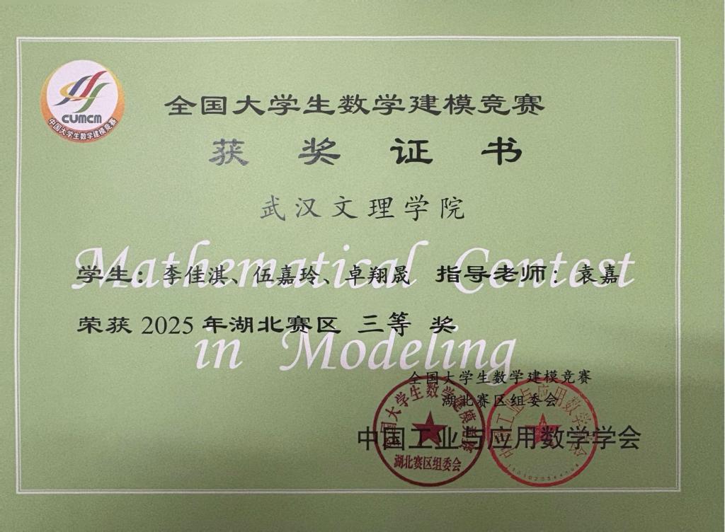近日,2025年全国大学生数学建模竞赛湖北赛区获奖名单揭晓。我校首次参赛便崭露头角,77779193永利官网集团选派的两支代表队在激烈角逐中脱颖而出,分别荣获一等奖和三等奖。
