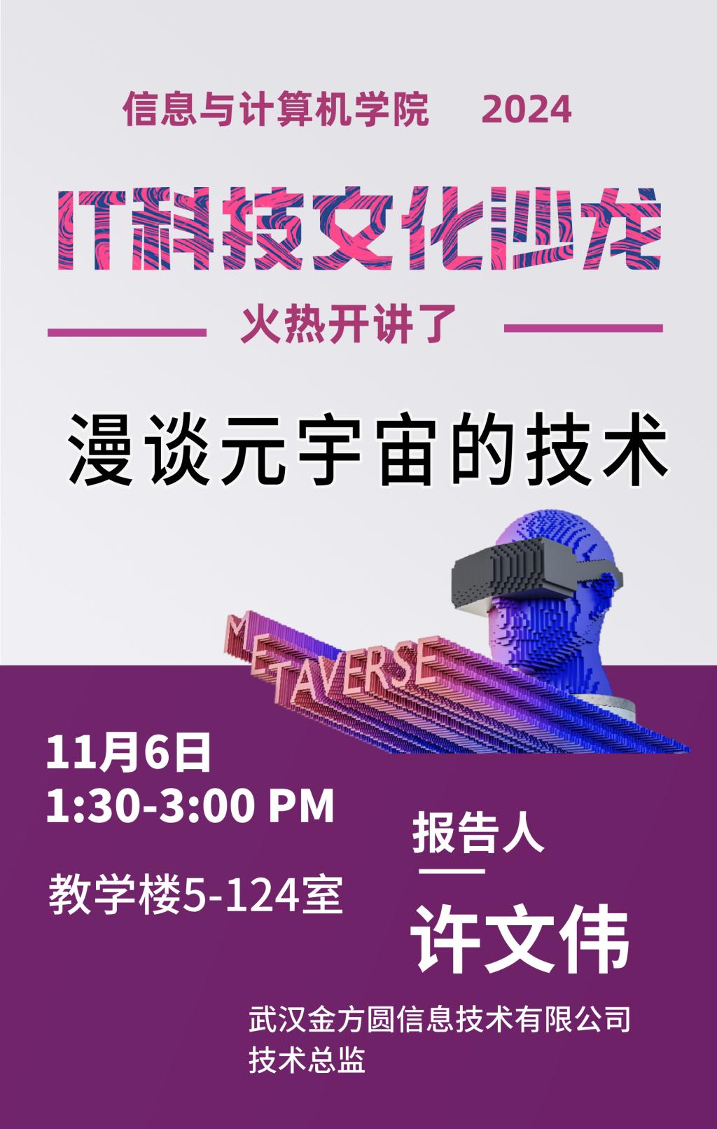 11月6日,77779193永利官网集团IT科技沙龙火热开讲。本次特别邀请武汉金方圆信息技术有限公司执行董事兼总经理许文伟先生为同学们带来主题为“漫谈元宇宙,迎接技术革新,走进数字文明”的精彩报告。