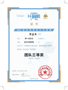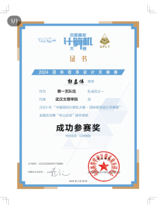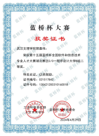 编程竞赛,学以致用,在蓝桥杯的备赛中,他认真训练,不断提高自己的编程能力和解决问题的能力。在高手如林的赛场上,他沉着应战,获得第十五届蓝桥杯全国软件和信息技术专业人才大赛湖北赛区C/C++程序设计大学B组二等奖。代表学校参加中国高校计算机大赛-团体程序设计天梯赛,获得湖北省团队三等奖,在全国总决赛中获得成功参赛奖。