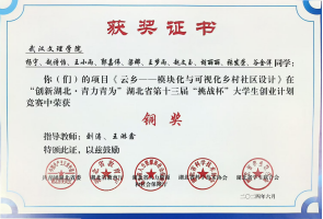 科技创新,挑战自我,作为新时代的大学生,他秉承着学以致用的精神,积极投身于“挑战杯”大赛,全程参与构思了云乡项目计划书。采用四层控制系统,解决了技术难题。作为技术管理总监,他负责前端设计,使用HTML+CSS搭建了友好的用户界面,并自学Javascript和前端框架,提升用户体验。最终荣获湖北省第十三届挑战杯省铜奖。