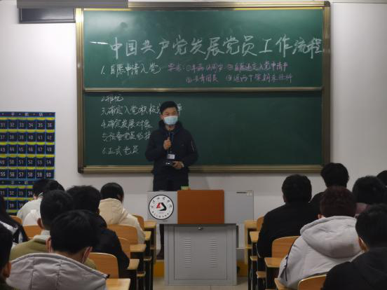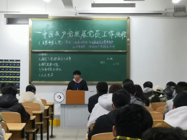 学院分团委书记尹浩扬老师要求同学们从现在开始端正思想态度,时刻以一个党员的标准要求自己。他鼓励全体学员牢记习总书记关于中国共产党人初心和使命的诠释,将自己的奋斗目标和党的初心与使命相结合,自觉投入到祖国发展和民族复兴的建设中去;劝勉同学们不仅要在组织上,更要在思想上加入党组织,通过深入了解党的发展奋斗历程,领悟并践行党的宗旨。鼓励同学们自觉主动地参加学校、学院、班级等组织的各项实践活动,通过在实践中展示自我、发展自我,塑造德性和能力,为加入党组织打下坚实的自身条件和群众基础。